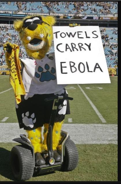 This Sunday the Jacksonville Jaguars mascot might have taken a joke overboard with the sign made during the fourth quater in the against the Steelers. We all are aware of the Steelers infamous "Terrible Towel" and the updated case in Dallas with ebola and in west Africa. Yes ebola is a major crisis in the world today killing thousands. On the other hand Jaxson was making a competitive joke and using the current news to do so. Across the nation views on this incident were on both sides of the fence.Against the sign:
